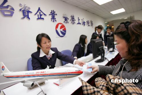 上海台湾同胞投资企业协会所在地,是此间中心城区唯一集中出售东航、上航包机机票的出票点。清晨七点半,东航、上航的近二十名工作人员纷纷到位,为赶早前来的台胞提供最新购票讯息。上航售票位还张贴出一张张特印有上海名胜风景的大红色包机广告,显得格外喜气。