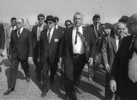 图为以色列政府新闻办公室公布的资料图片,1981年10月10日,在埃及首都开罗,时任以色列国防部长沙龙和内务部长伯格、外交部长沙米尔陪同贝京总理步行参加遇刺埃及总统萨达特的葬礼。 (春风)