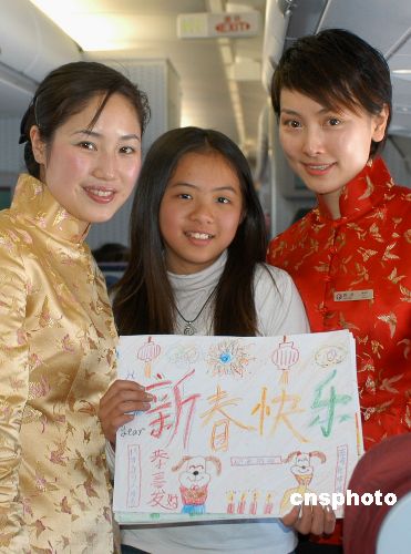 执行台商包机的东方航空公司空姐们身着靓丽唐装,在飞机上与台胞欢喜过大年。她们还准备了蜡笔和画本,以“绚丽新年”为主题组织台湾小朋友进行绘画比赛。图为东航空姐与展示自己心中绚丽新年的台湾小“画家”在一起留念。作者:朱怡
