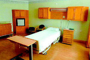 产房位于医院二楼。据工作人员介绍,除了剖腹产房,其余每间自然产的产房的设备都是一样的。记者一推开产房的门,就发现产房的空间太大了,大约有三四十平方米左右。进门一米左右,有宽大的布帘遮蔽了产房,保证产妇的隐私。这里和普通医院的产房不一样,它设置了供亲人休息的沙发床,并随时更换新的沙发床罩子。产床是脚踏式,可以随时调整高度,以适应产妇的要求。产妇待产便入住产房,其间一直到生完孩子离开,产房的空气都是经过空气交换设备净化的,门一关,空气自然换成清新的了,产房内自然消毒,可确保产房处于无菌环境,不会受任何感染。