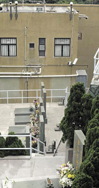 香港明报记者昨晨趁清明节,再次到访庄月明的坟墓,发现有人已换上了一束束的鲜花,更引来蝴蝶飞舞。保安措施亦明显加强,除通往该坟墓的楼梯遭封闭外,附近坟场办事处的顶层,更加装了3部闭路电视,严密地监察着坟墓四周及楼梯的情况。