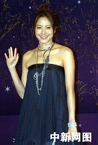 图:影后候选人林嘉欣穿蓝色低胸雪纺裙亮相