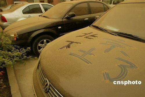 中新社北京四月十七日电 (记者 沈嘉)遭沙尘夜袭,十七日初睁惺忪睡眼的北京人发现他们的清晨再次如黄昏般灰暗。该市私车车主出门时看到,他们的爱车被一层薄雪般的黄土覆盖,这是在前六次沙尘来袭时未有的景象。