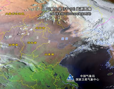 今天上午07:02分FY-1D气象卫星监测显示,北京、天津、山西北部、河北大部、山东北部和渤海地区出现了大范围的浮尘天气,经估算沙尘影响面积约为30.4万平方公里。