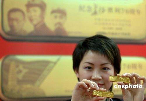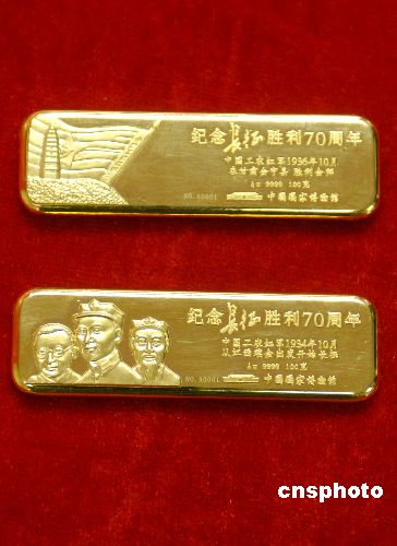 五月九日,中国国家博物馆工作人员展示“长征金条” 。当天,中国国家博物馆在北京正式推出“长征胜利70周年纪念金条”。“长征金条”每套包含两根一百克的千足金条,第一根金条正面精雕了长征途中“三人军事小组”毛泽东、周恩来、王稼祥三位领导人形象,并标注了红军开始长征的说明。第二根金条正面则精雕了迎风飘扬的中国工农红军大旗和革命圣地延安的宝塔。金条背面,均铸刻了毛泽东的《长征》诗句。作者:韩艺冰