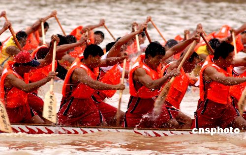 五月三十一日,由印尼、马来西亚以及中国香港、台湾和内地地区十六只队伍角逐的首届国际客属龙舟邀请赛落下帷幕,广东河源队夺得冠军,印尼、马来西亚以及中国台湾金门代表队夺得优秀奖。图为河源队在比赛中奋勇争先。中新社发 王东明 摄