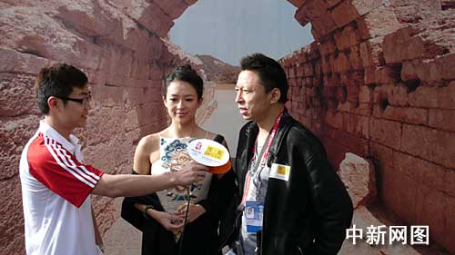 图为张朝阳(右)、章子怡(中)在接受记者采访