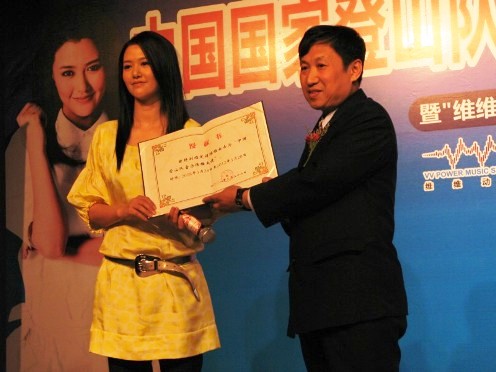 中新社北京三月三十一日电(记者 张希敏)今天,青年歌手谭维维从中国国家体育总局登山运动管理中心领导手中接过授予函,至此,她已成为中国登山队音乐形象大使,并作为北京奥运会珠峰圣火放歌第一人。