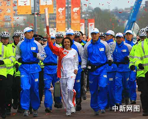 第80名火炬手,雅典奥运会女子800米和1500米冠军凯利·霍尔姆斯手持火炬跑向位于格林威治千禧宫的终点。作 者:李鹏