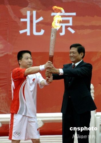 8月6日上午,北京奥运火炬传递在午门正式开始。图为“航天英雄”杨利伟从北京市委书记刘淇手里接过首棒火炬。中新社发 王东明 摄