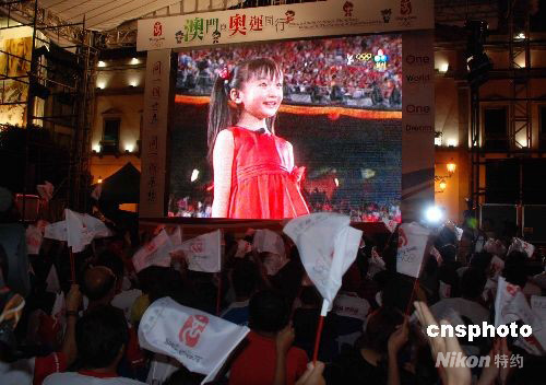 八月八日晚,澳门市民在议事亭前地通过大屏幕观看北京奥运会开幕式,不时发出阵阵欢呼。 中新社发 毕永光 摄