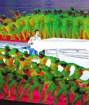 演出下篇开始,只见郎朗坐在一片蓝色的海洋中,身边坐着一个天真稚气的小女孩儿,围绕在他周围的是无数穿着高科技发光服的“绿”人,郎朗面带微笑,一脸轻松和愉悦,音符从十指间滑出,周围的场景随之不断发生着奇妙变化,蓝色的海洋开始呈现出中国现代化建设成就,青藏铁路也出现在郎朗的脚下。而“绿”人身上的光也随之变化为银色,变换出和平鸽、银河等造型,最后浓缩为一座微型的鸟巢,郎朗在“巢中巢”欢快地弹奏,一个小女孩飞进巢中巢,乘着风筝飞到他面前,充满诗意。整个节目长达8分钟,成为本届开幕式上分量最重的个人演出。在演出结束的第一时间,通过万宝龙公司的帮助,本报对郎朗进行了专访。