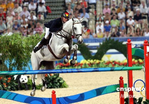 八月十二日,在香港举行的奥运马术三项赛进行最后一项场地障碍赛,德国选手欣里希·彼特·罗迈克获得个人赛金牌。中新社发 洪少葵 摄