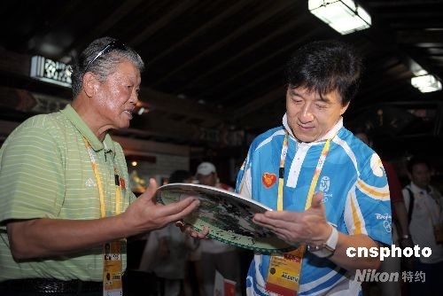 图:李铁映与成龙在奥林匹克公园赏瓷器