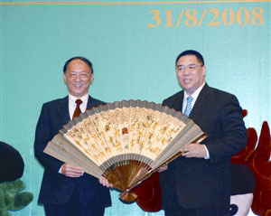 图:刘鹏向崔世安赠送纪念品。(图片来源:澳门日报)