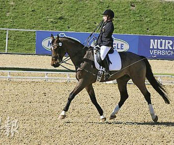 失去双臂的德国女骑手Bettina Eistel,在上届残奥马术赛中以口控制缰绳,夺得一银一铜佳绩。(图片来源:明报)