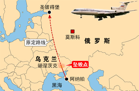 中新网8月22日电 据法新社报道,俄罗斯一架载有170名乘客的图-154客机今天在乌克兰上空失事。目前已找到了30具遇难者尸体。图为客机坠毁地点示意图。(春风)