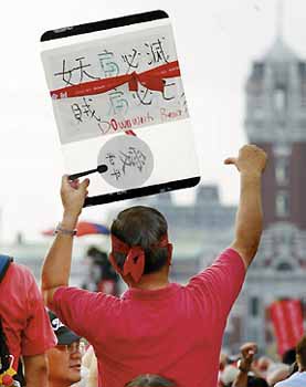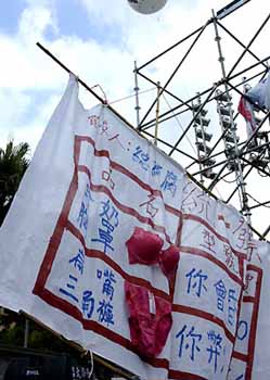 岛内倒扁反贪腐静坐9日起如火如荼的展开,全台各地倒扁民众纷纷走上街头以自己的方式表达自己对陈水扁家庭弊案的抗议。他们有的身着红衣、戴着红帽,有人携家带口,有人坐着轮椅,有人从台湾中、南部专程赶来。民众发挥创意,把各种创意以及奇装异服都带到静坐现场,以讽刺时政。