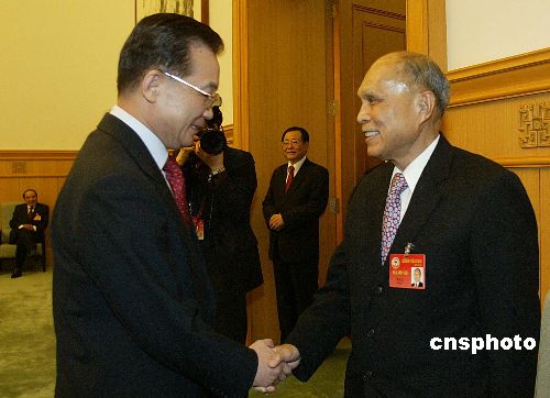 图为霍英东2005年在全国政协十届三次会议开幕大会上与国务院总理温家宝握手。中新社发 廖文静 摄