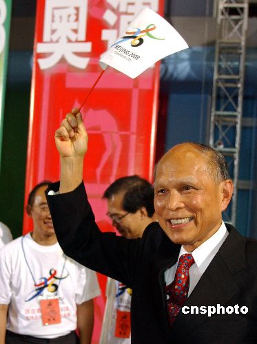 图为霍英东在香港九龙公园庆贺北京申奥成功时的情景。中新社发 任晨鸣 摄