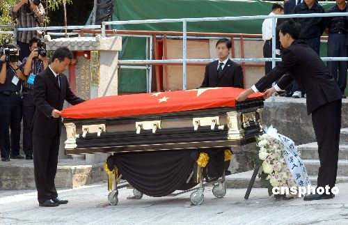 11月10日,已故全国政协副主席霍英东在香港柴湾佛教坟场安葬。中联办两名官员进行一个简单的收国旗仪式,移交予霍英东的家人。完成仪式后,霍英东的灵柩慢慢被移送至墓地安葬,由长孙霍启刚手捧霍英东的遗照,引领其他家属,进行旺冢仪式。中新社发 邓庆乐 摄