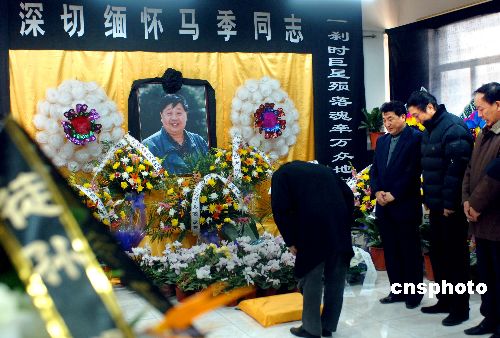 十二月二十一日,中国广播艺术团说唱团为马季先生设立的灵堂,其生前徒弟姜昆、冯巩等为其守灵。二十日上午十时二十五分,中国著名相声表演艺术家马季因心脏病突发,抢救无效,病逝于北京家中。中新社发 廖攀 摄