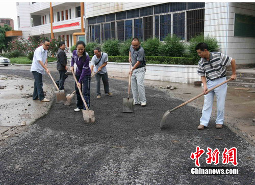 在工地上,记者见到了正在监督工程质量的官盛镇小学校长袁道川,过于疲倦的双眼深陷,但仍显得精悍而干练。“从7月18日起,我们的教职员工和班子成员都在坚守岗位,由于今年的水位高、淤泥多,校园恢复重建难度相当大。为了对全乡的中小学生负责,必须加班加点地重建。300套学生桌凳全部到位,8月30日,学生顺利入学没有问题。”