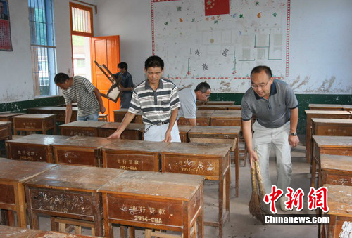 26日上午,记者来到在“7.19”洪灾中受损严重的广安区厚街小学,只见5名电工正在安装照明线路,工人正在清除卫生死角垃圾,教师正在搬运桌凳,忙得不亦乐乎。