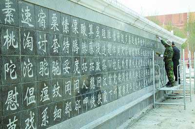 新扩建的百家姓广场上,新建的5面中华姓氏墙已基本完工,工人们正在进行扫尾工作。