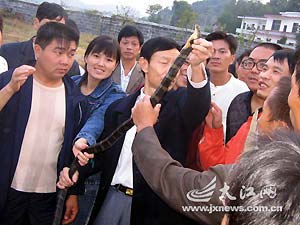 10月16日,本报(注:江南都市报)记者赴宜春向蛇王老黄拜师学艺,既感受了随蛇王体验抓毒蛇时的心惊胆战,也听到了蛇王惊心动魄的历险故事。