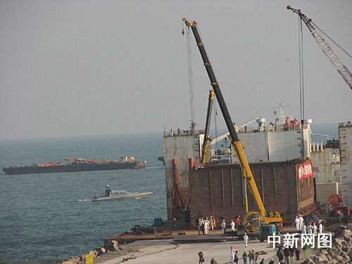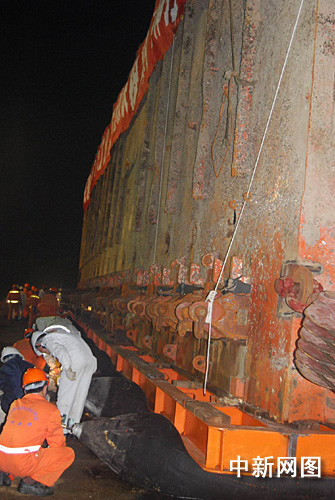 据介绍,今天适逢一个月内潮位最高之日,本最有利于“南海一号”登陆。经过今晚约两个小时的努力,“南海一号”在甲板上被拖移了约十六米,但离码头尚有约八米。