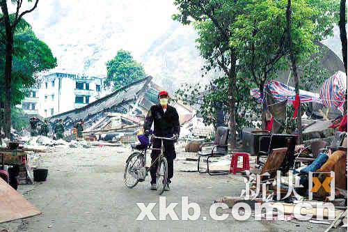 刘相宇第二次进映秀时捡了一辆自行车查看灾情。