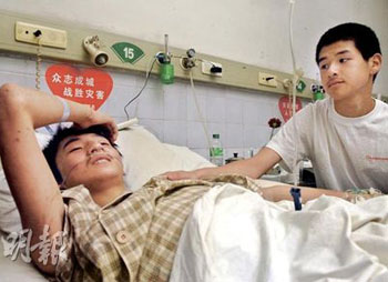 不过,医院工作人员表示,廖波的伤口有感染征状,可能需要再动手术,他也经常做噩梦而惊醒,一次次回到地震当天的情景,想起遇难的同学就会流泪。见此情况,李阳想多陪廖波几天,在医院亦有北川中学的老师,答应照顾李阳的衣食住行,并会在他复课前带他返校。