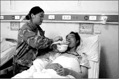 昨天是陈仁平在绵阳第三医院的最后一晚,胃口极好的他晚餐吃了3个饺子。在北川陈家坝的山中被埋后,56岁的陈仁平靠着两个鸡蛋硬撑了169个小时,经过诊断,他的盆骨骨折。