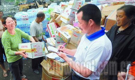 上午10时,一辆卡车正在装救灾物资。车旁,站着一名戴眼镜的男子。他叫张华峰,发放物资工作人员之一(之前是收发放物资工作人员)。他一脸黝黑,看上去十分的疲倦。“收发救灾物资并非想象中的简单,实际上十分的繁琐,责任重大。”张华峰深有体会地说。