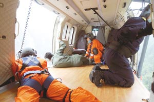 得到前线救援人员通过海事卫星报告的消息后,27日下午,救援直升机冒着危险,在距地面10米的空中展开搜索。“看,下面有人影!”飞机盘旋了很久,但因当地有一排密集的高压线,飞机无法降落,眼看大雾越来越浓,救援直升机只得返回广汉机场待命。