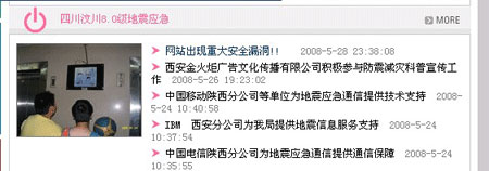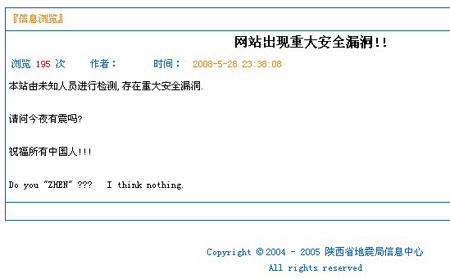 28日23时38分,记者正常登录到陕西省地震局网站(陕西省地震信息网)时,在该网站首页“四川汶川8.0级地震应急”栏目中发现一条题为“网站出现重大安全漏洞”的信息,点击进入后内容显示“本站由未知人员进行检测,存在重大安全漏洞”,并随后附有三条“网友留言” 。