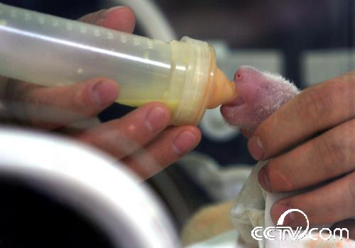2008年7月7日上午,在中国保护大熊猫研究中心雅安碧峰峡基地,工作人员正在育婴箱内,给大熊猫帼帼7月6日刚出生一对双胞胎的老大,成功进行人工进食喂养;而双胞胎的老二目前则由大熊猫帼帼亲自给它进行母乳喂养。