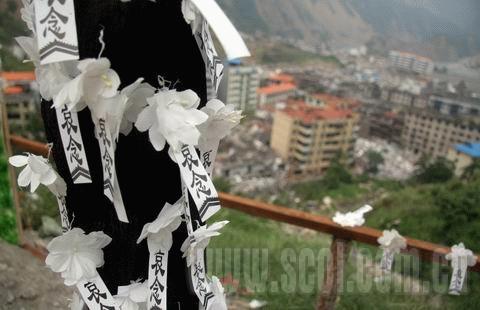 在一个被当地人称为“三倒拐”的地方,铁血四十师在此拉起了一方横幅:沉痛悼念北川遇难同胞。横幅下面摆放着一个大的花圈,花圈两边分别是假花拼成的“5·12”和“北川”字样。横幅下的栏杆上,密密麻麻贴着写有“哀悼”二字的小纸条,每一个纸条,代表着一个亡灵。