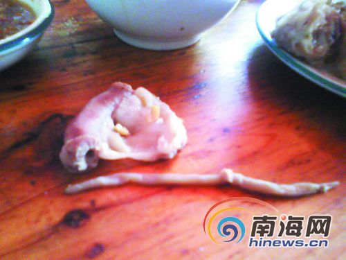 下午2时许,记者赶到位于海口美苑路的该骨汤店,看到王先生一行人坐在餐桌旁正和店方交涉。餐桌一角的猪粉肠旁边赫然横着一条约9厘米长的寄生虫。