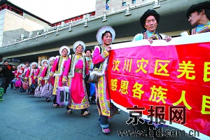 在排练基地,有26名穿着羌族服装的演员非常引人注目,他们都是来自汶川、茂县等地震重灾区的村民,昨天中午1时刚刚抵达北京。