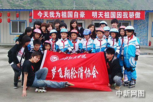 中新网武汉5月12日电 (杨宏斌 刘英)湖北经济学院轮滑协会13名成员自费赴四川汶川地区,给汶川县映秀小学、水磨小学的孩子们带去了24双轮滑鞋子和护具,并对他们进行培训,希望通过轮滑运动,见证跌倒之后爬起来的勇敢人生。