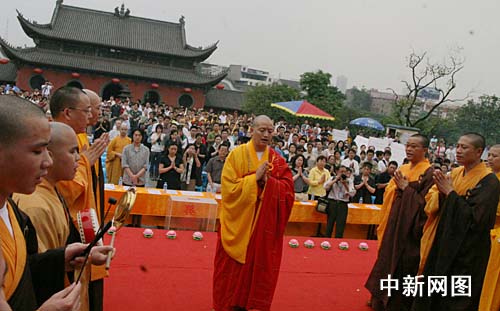 中新网重庆5月12日电 (孟幻 张晅)12日,汶川大地震周年祭之时,重庆佛教界人士在重庆华岩寺举行悼念及祈福活动。14时28分,在场僧众及300余位信众默哀3分钟。随后,华岩寺方丈道坚法师带领僧众举行祈福消灾法会,为汶川地震灾区诵经祈福,同时祈求风调雨顺,国泰民安。完