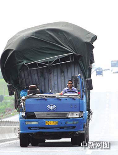 中新网杭州7月27日电(记者 龚读法 通讯员周铭)在7月25日下午,记者在浙江省杭州市采访途中发现非常雷人的一幕:104国道瓶窑段,一辆闽C牌照的大货车,满载货物急速行驶着,但是仔细一看,这辆货车的驾驶室却是“敞篷”的。这样的景象叹为观止。