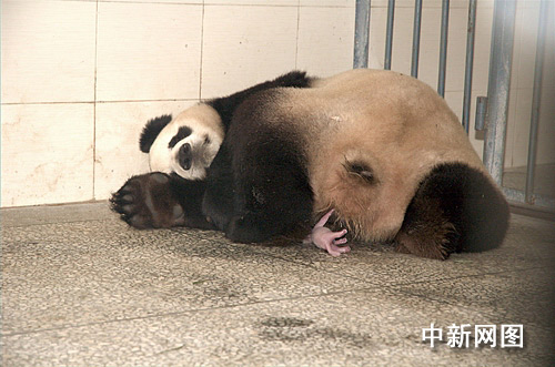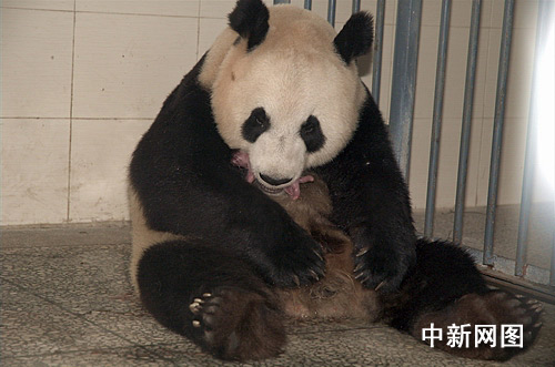 7日晨6点46分,“甜甜”开始出现产前征兆,8点13分破羊水,在经过3个多小时的努力后生下一对健康的双胞胎。初次当妈妈的“甜甜”努力尝试将宝宝叼在怀里,但小仔乱动乱叫,很快又滑落到了地上,经过多次努力,小仔终于在妈妈怀里安静下来,“甜甜”用舌头轻舔着宝宝的身体,俨然是位称职的母亲。产下第二仔以后,工作人员随即将第一仔取出送往育婴室进行人工育幼,经初步检查,该宝宝是雄性,体重146.2克,各项身体指标正常。