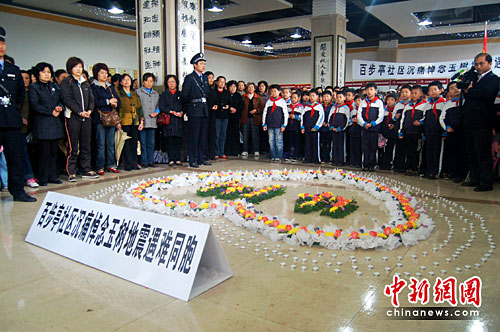 上午10时,数百名武汉百步亭居民、育才小学学生代表有序来到社区活动中心。在工作人员的引导下,他们静静地围绕着用鲜花扎成的“4.14之心”分排站好,手捧蜡烛,向遇难同胞默哀。活动现场,居民自发手折纸鹤,以此寄托对灾区民众的牵挂与祝愿。