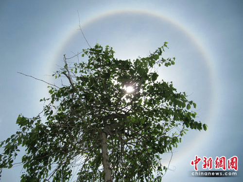 中新网乌鲁木齐6月27日电 27日中午,新疆石河子市上空出现日晕奇观。仰望天空,太阳周围有一个以太阳为中心的圆形彩色光环,光环内圈是暗红色的阴影光圈,其外是由红、黄、蓝色组成的彩色光圈,光环很像一道美丽的彩虹。