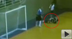 实拍:一室内足球队员滑倒被地板碎片