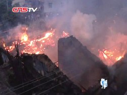 消防队员用一支高压水枪压制堵截火势蔓延。10分钟后,火情得到控制,随后用火钩将部分阴燃的货物钩到地面,再进行打压扑灭。经过近半小时的全力扑救,才将大火全部扑灭。