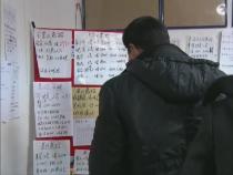 【解说】南京一家工厂的老板在安德门民工市场门口竖着牌子现场招聘,今年他的工厂希望招聘40名学徒工。